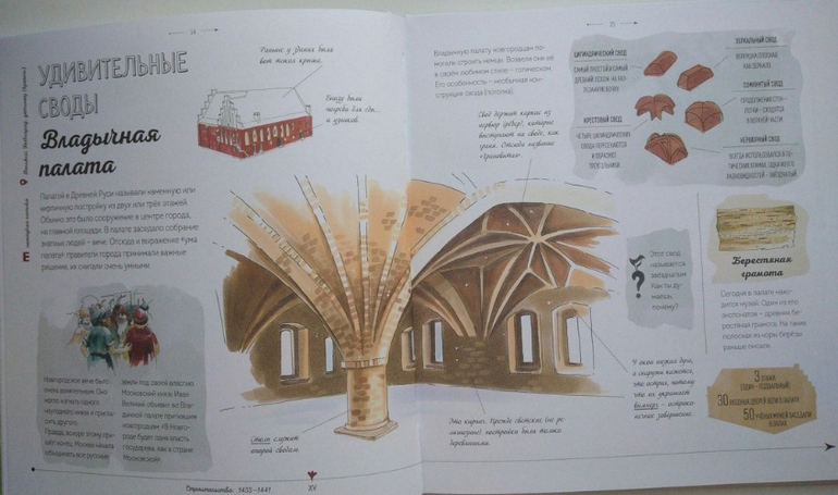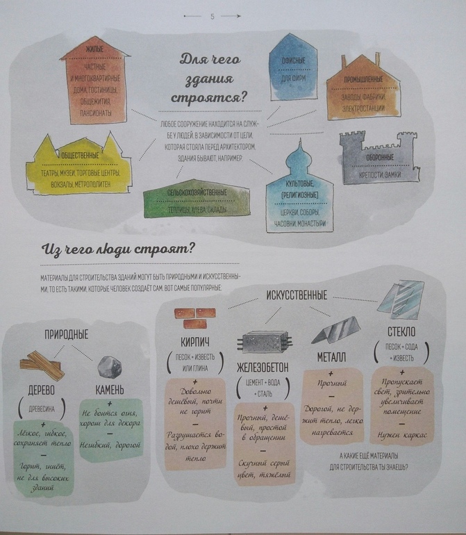 Мой книжный червячок сразу проявил интерес к новой энциклопедии, стала расспрашивать что это за церкви и дворцы, кто их построил.. На первом развороте мы познакомились с дятлом по имени Арх, который рассказал нам о мире архитектуры) Славке нравятся такие персонажи, она сразу вовлекается в диалог, старается вникнуть в тему. Так мы узнали, что же такое архитектура, и что в ней самое главное, повторили, из чего состоят здания, какие они бывают по своему назначению, а также обсудили материалы, которые используются при строительстве.