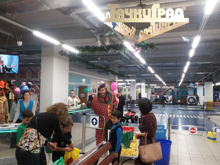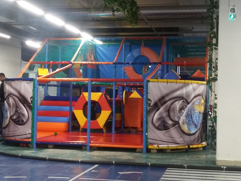 Наши впечатления. Начнем с того, что это пространство мы еле нашли в огромном торгово-развлекательном комплексе! Оно на цокольном этаже. И указателей нет! Пришлось пытать охрану. Подсказали. Спустились. Увидели гардероб и остров с игрушками. И на нем выпиленный логотип: