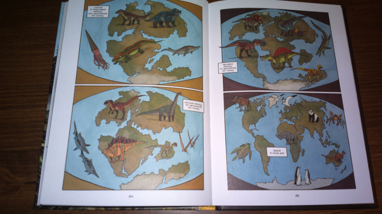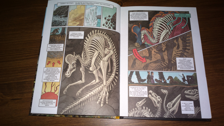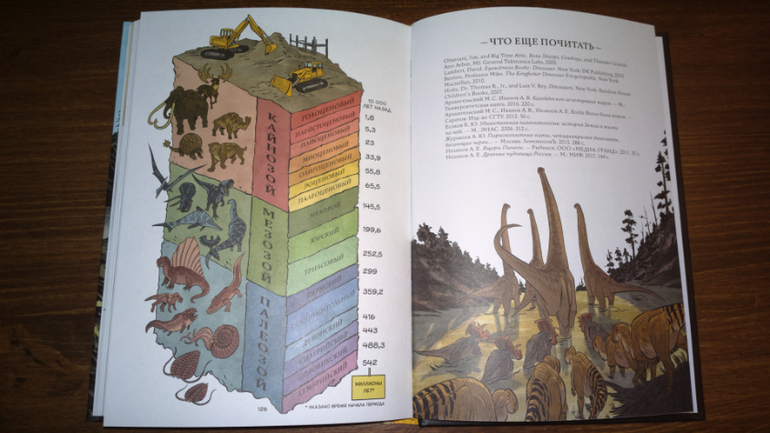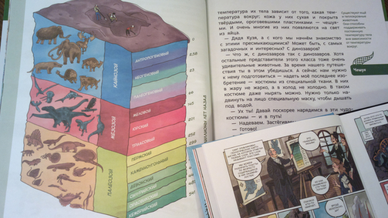 Кстати, обе эти книги перекликаются друг с другом. В энциклопедии с Чевостиком мы видим картинку с эрами и периодами развития жизни на земле. И в книге "Динозавры. Научный комикс" мы читаем о том, что Уильям Смит опубликовал геологическую карту, на которой отметил разные слои, которые назвали пластами.