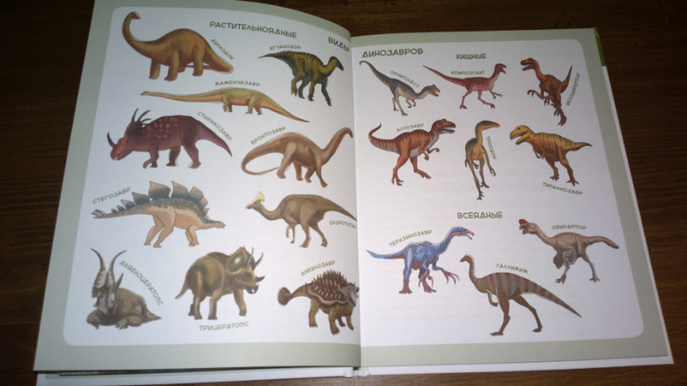 Мы, например, долго можем играть с сыном в "Угадай-ку!" по этим иллюстрациям. Один из нас берет книгу, читает название динозавра, а второй угадывает, к какому виду относится указанный динозавр: растительноядные или хищники.