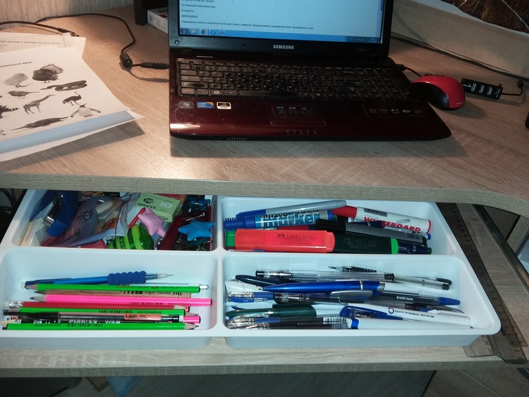 Карандаши у меня в икеевском лотке для ложек, намертво прикрепленном к выдвижной полке письменного стола: