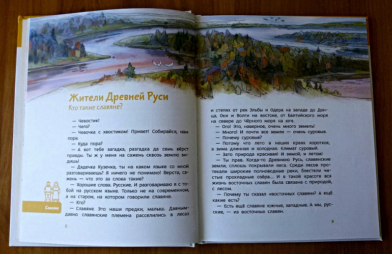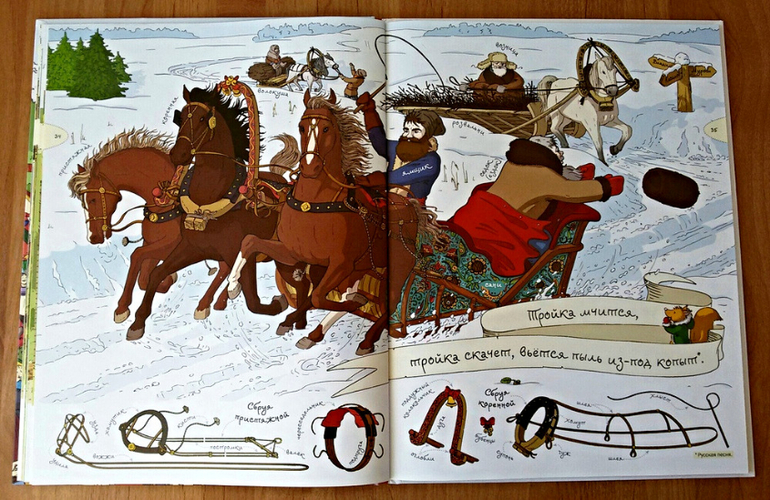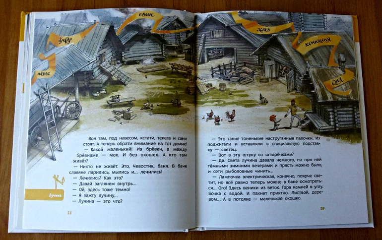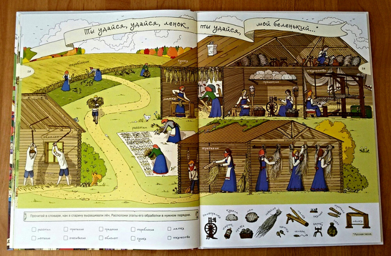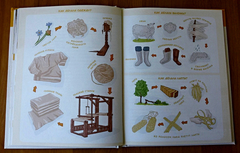 Вместе с Чевостиком и дядей Кузей мы побывали в русской избе. Очень удивительно и необычно для современного ребенка оказаться во дворе древних славян. Посмотреть хотя бы на картинках, где и как они жили, что ели и во что наряжались. В энциклопедии подробно и наглядно показано, из каких материалов и каким образом раньше делали одежду. Подробно рассмотрен процесс пахоты, рассказано об орудиях труда и выращиваемых культурах.