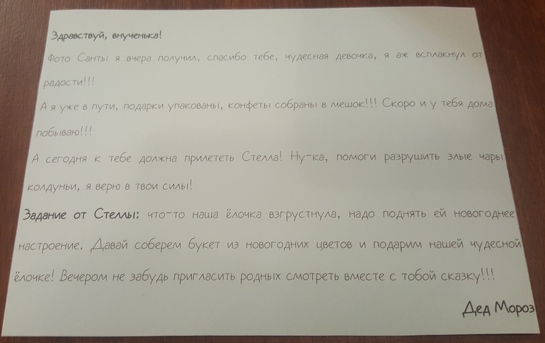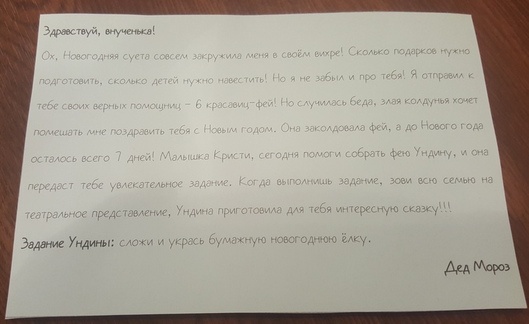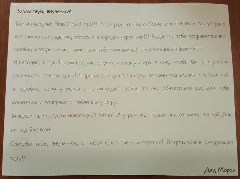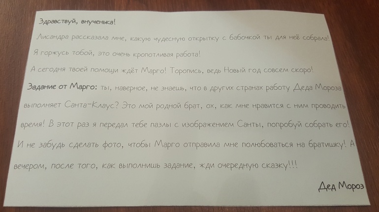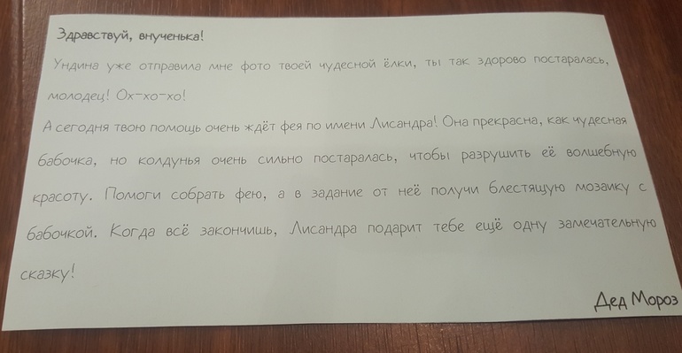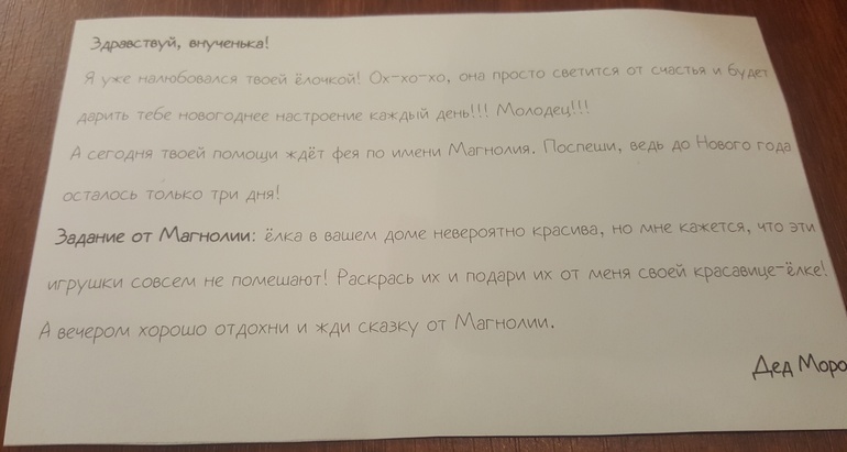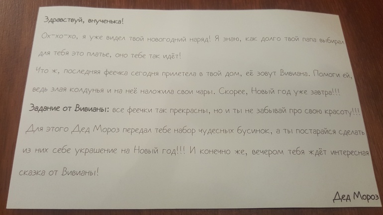 Начиная с третьего дня адвента, мы перестали собирать фей, так как Кристина не проявляла к этой работе особого интереса, а делать это за неё я не посчитала нужным. Я решила оставить фей для другого случая, на тот возраст, когда это будет ей действительно интересно. И мы стали выполнять только задания, которые ей стал передавать сам Дед Мороз без участия фей.