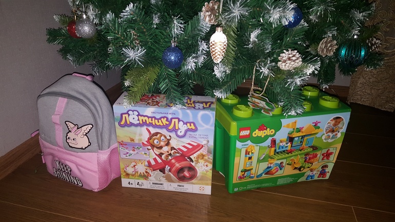 1 января утром дочка нашла под ёлочкой свои подарки, которыми осталась очень довольна.