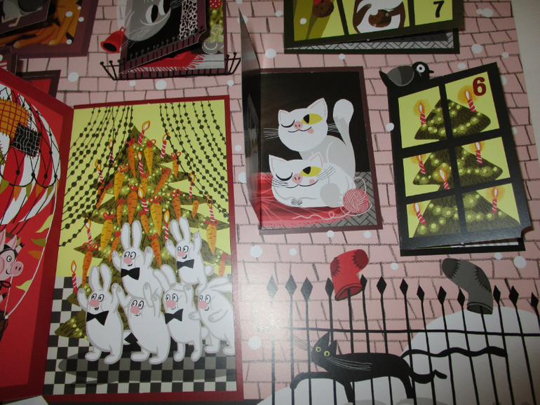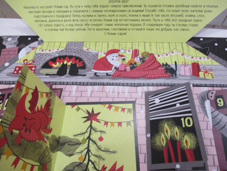 Адвент-календарь «Новый год вот-вот...» выполнен в виде домика с 14 окошками, в котором живут самые разные обитатели (пингвины, динозаврик, зайчики, летучие мыши, слон, еноты и другие).