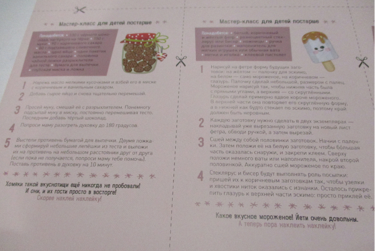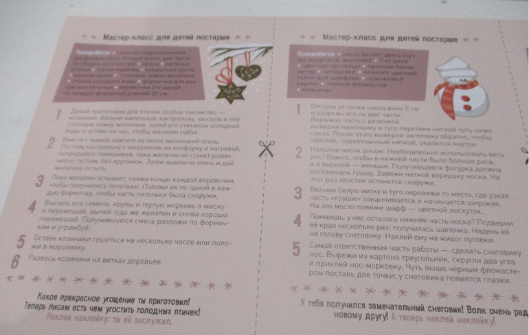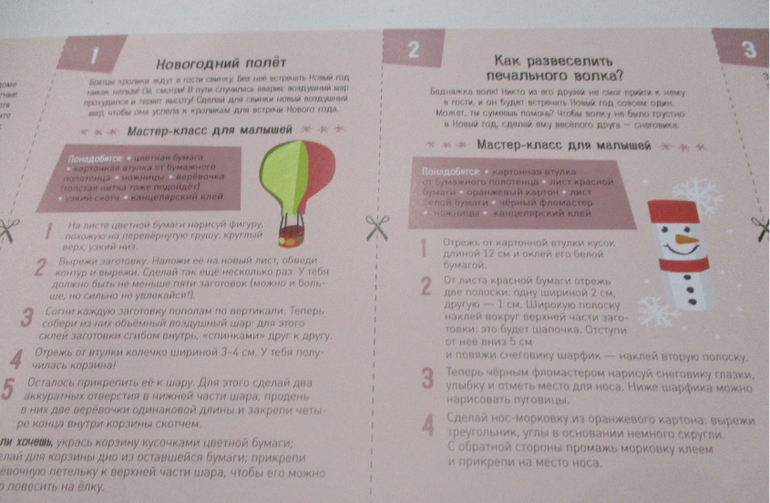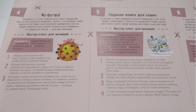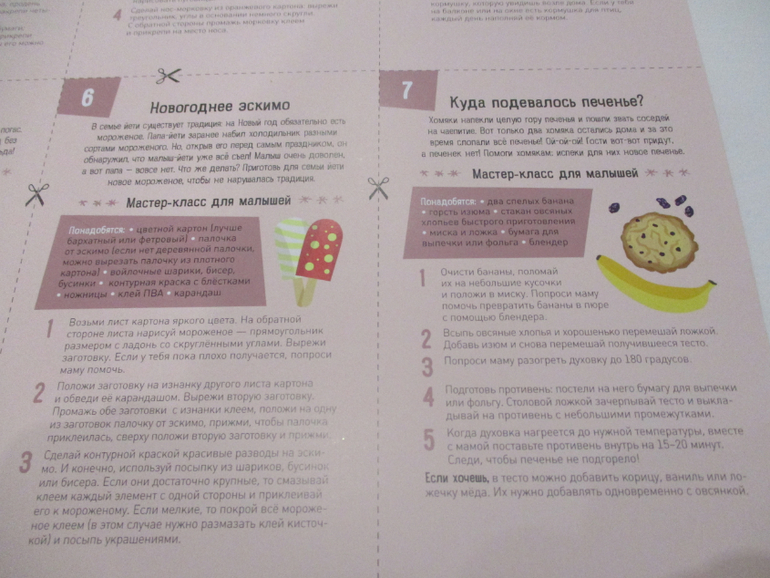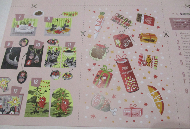 Задания в этом адвент-календаре больше ориентированы на девочек. Девочки любят мастерить, украшать, помогать маме приготовить новогоднее печенье или сладить мороженое. Все задания в календаре очень творческие и интересные. Каждому окошку и животному, живущему в окошке подходит свое задание.