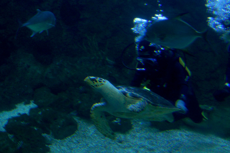 Ещё на суше тренер интересно рассказывал про черепах. И Тёмке очень хотелось подружиться с ними. Их в аквариуме две - мальчик и девочка. Мальчик гостей не любит и на контакт не идёт, а вот с девочкой можно договориться и даже на ней покататься!!!
