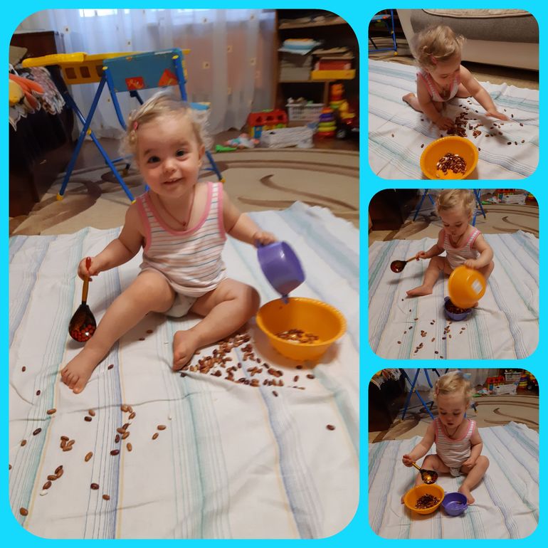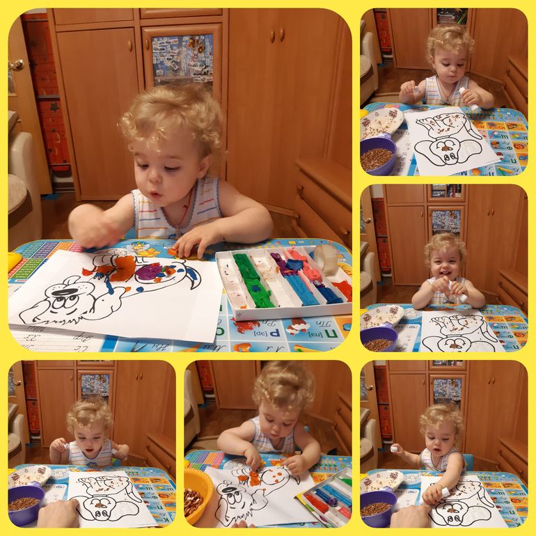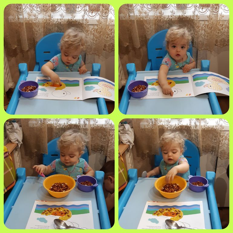 Больше всего Арише нравится играть с фасолью - может по полчаса вдавливать фасолины в пластилин, потом выковырвать... и в рот ![]()
