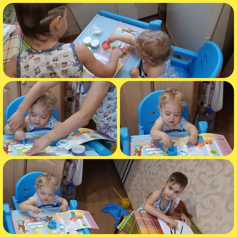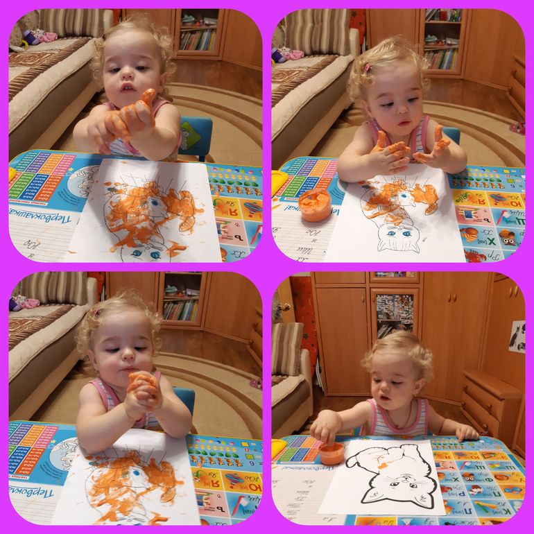 Пальчиковые краски тоже впечатлили, но не на лист их надо наносить, как оказывается, а между ладошками давлякать - а что,тоже отличный вариант!