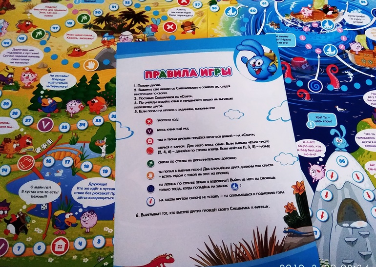 Одно мне непонятно: с какой целью разрезано поле в верхней части. Моим старым ходилкам более 20 лет и сохранились в отличном состоянии на сгибах (неплотный картон). Во время игры разрез мешает, а младший ребенок так и норовит разделить по разрезу игру на два поля.