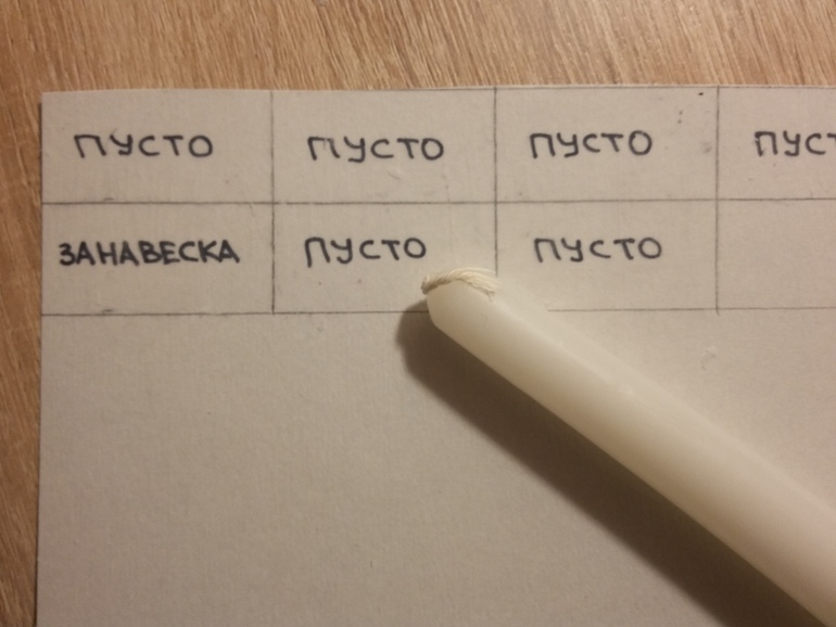 Защитный слой делается так: на картоне расчерчиваются карточки, наносятся слова. Затем слова надо затереть воском (я использовала обычную свечу):