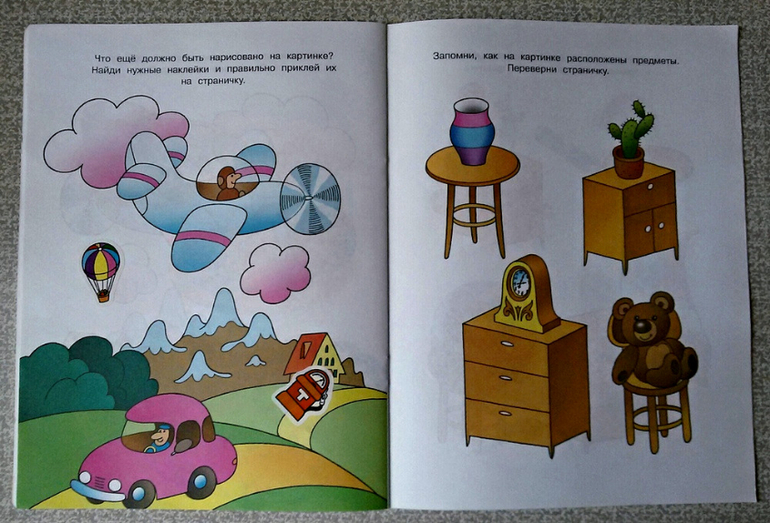 Пособия с наклейками у сына самые любимые. Тем более, что к данной тетради не нужны даже карандаши. Все задания построены по принципу: внимательно рассмотри картинку, запомни все, что на ней нарисовано и переверни страницу. На другой стороне нарисована почти такая же картинка, но на ней отсутствуют некоторые элементы или персонажи. Ребенку нужно вспомнить, что было нарисовано на предыдущей картинке и дополнить рисунок необходимыми наклейками.