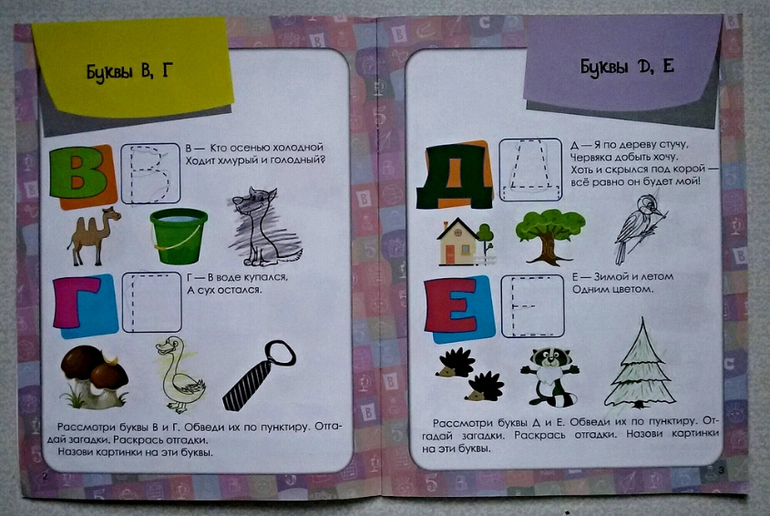 Данное пособие предназначено для изучения букв и алфавита с малышом. На каждом развороте по четыре буквы. Каждую из них нужно назвать и обвести по контуру. К каждой букве есть небольшая загадка и несколько картинок, начинающихся на эту букву. Ребенку предстоит назвать все предметы, найти среди них отгадку и раскрасить ее.