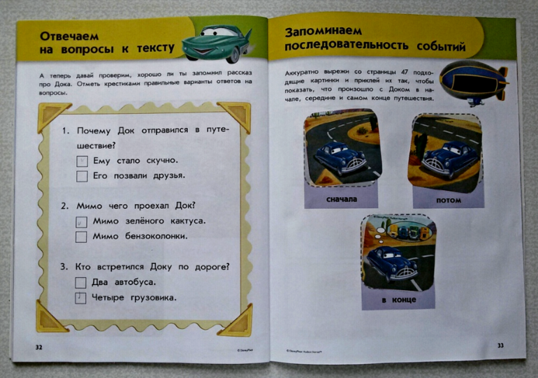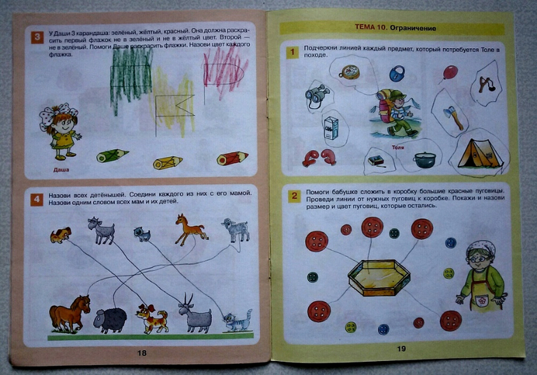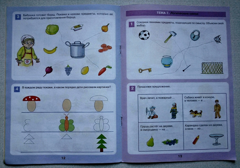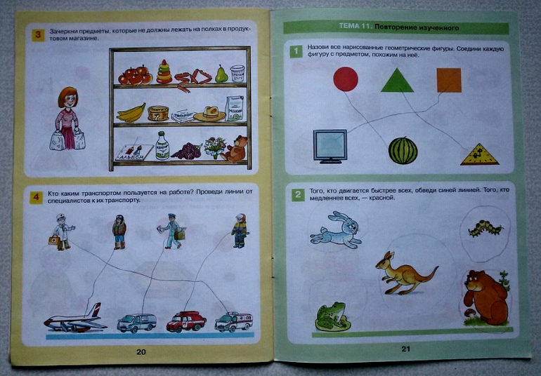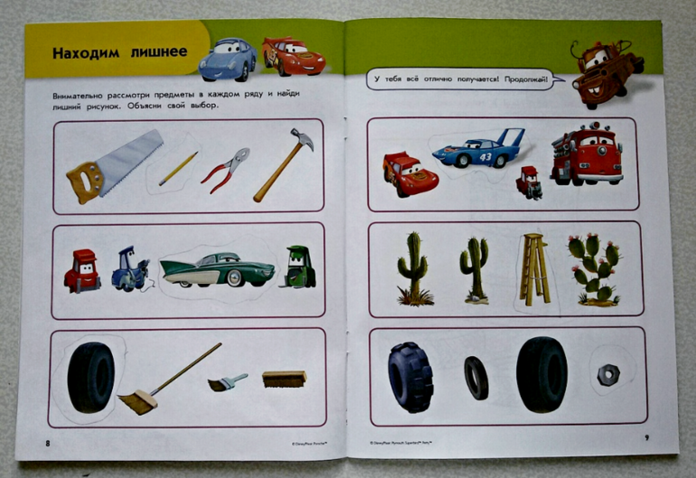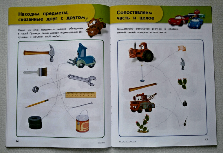 Пособие это мы прошли очень быстро. Да и как иначе, если на обложке и внутри обожаемые машинки. Все устные задания и упражнения, которые можно выполнить простым карандашом, были проделаны n - количество раз. Я даже не считала, ребенок сам осваивал ластик. А многие задания ему уже знакомы и понятны: найти лишнее или одинаковое, назвать предметы одним словом, соединить связанные смыслом предметы или целое и часть, найти отличия, описать предмет, придумать название к картинке, нарисовать недостающий элемент, найти нужный фрагмент, запомнить последовательность действий и многое другое.