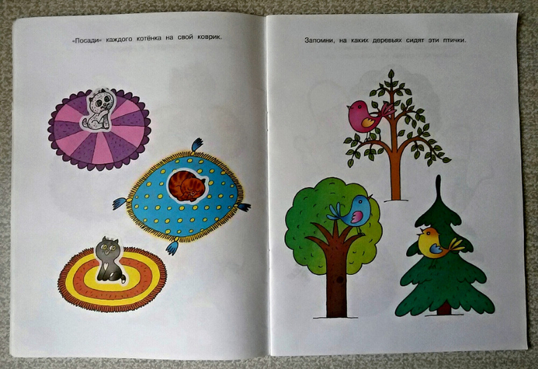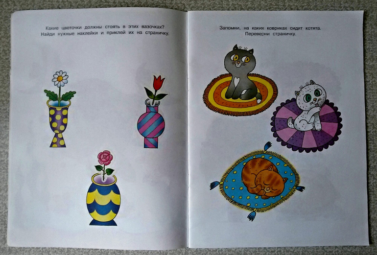 В некоторых упражнениях нужно запомнить, где именно находился предмет или животное и приклеить наклейки правильно, не перепутав место. Например, нужно запомнить, что белый котенок сидит на розовом коврике, рыжий - на пятнистом, а черный - на желто-оранжевом. Затем нужно перевернуть страницу и приклеить котят на нужные коврики.