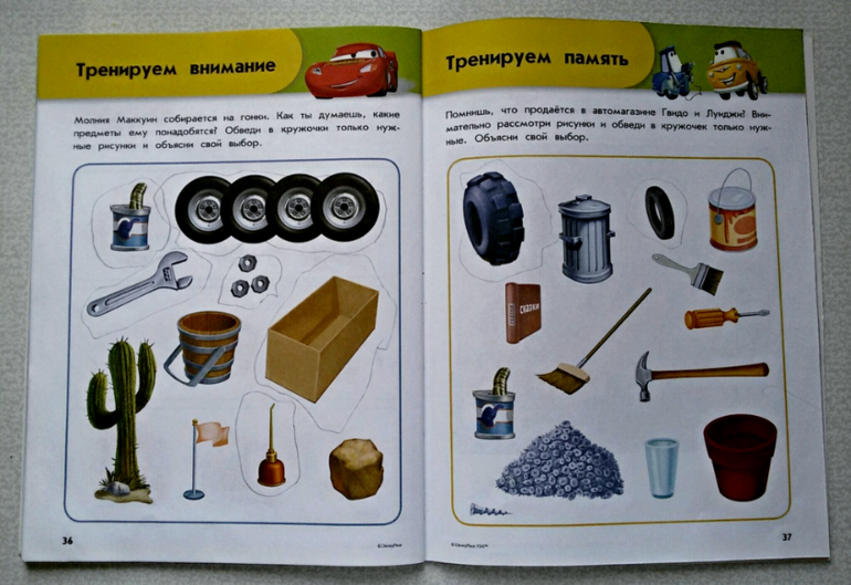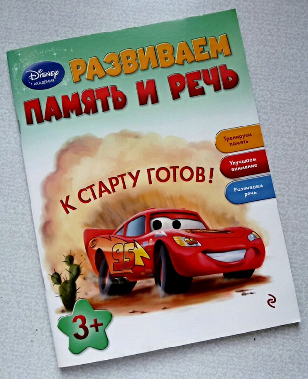 Также в тетради есть небольшая история про Молнию МакКуина и его друзей. В конце книги малыш найдет наградную медаль и игру "Найди пару". Осталось только их вырезать и можно идти тренировать внимание, память и опять обыгрывать маму с сестренкой.