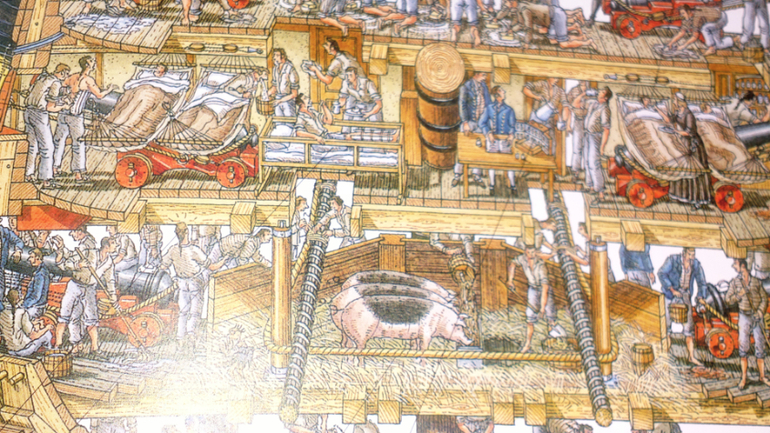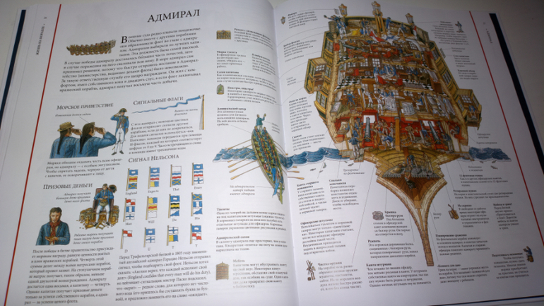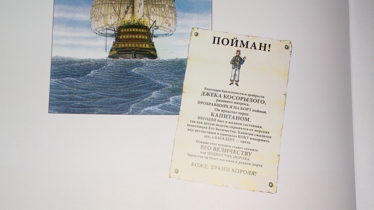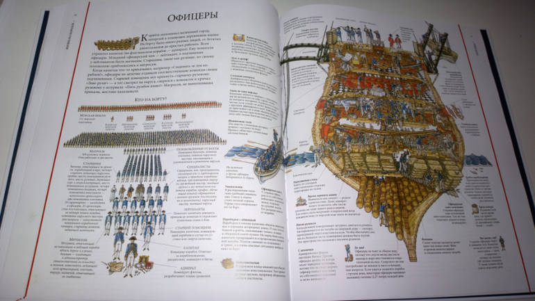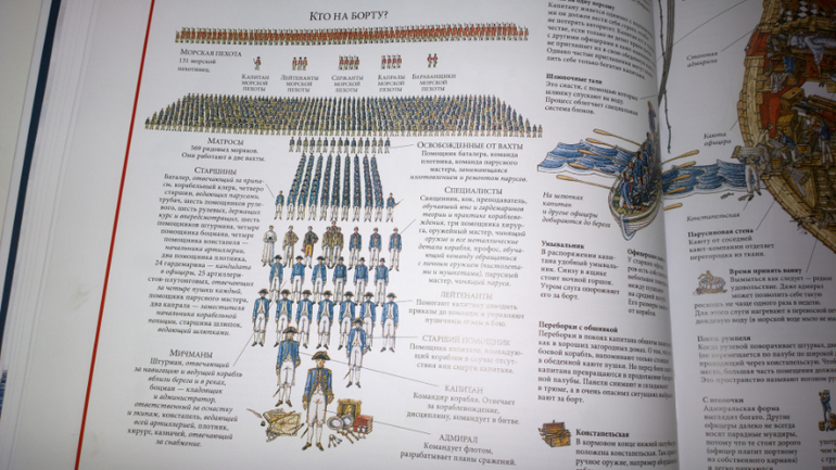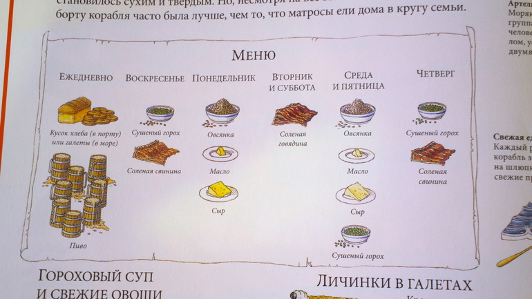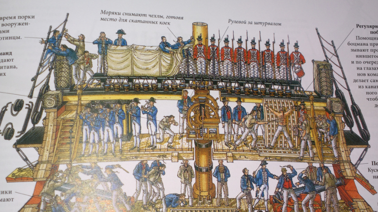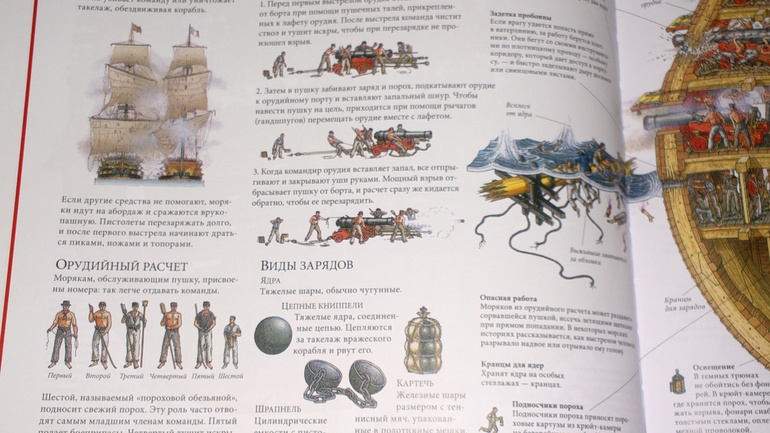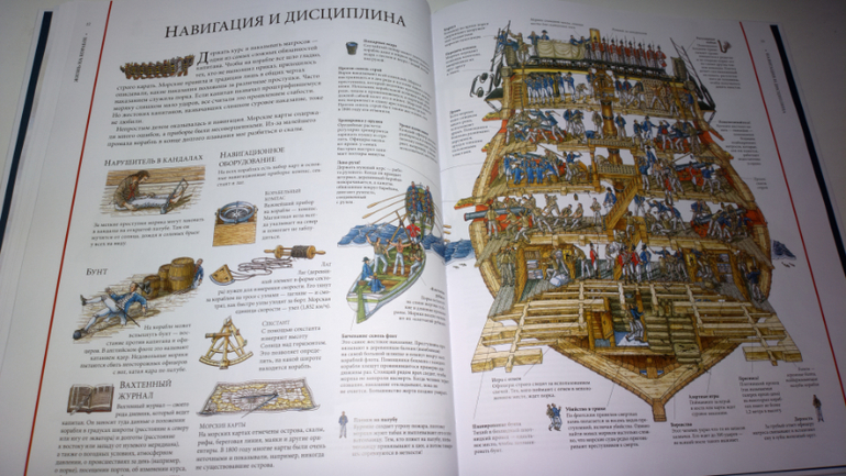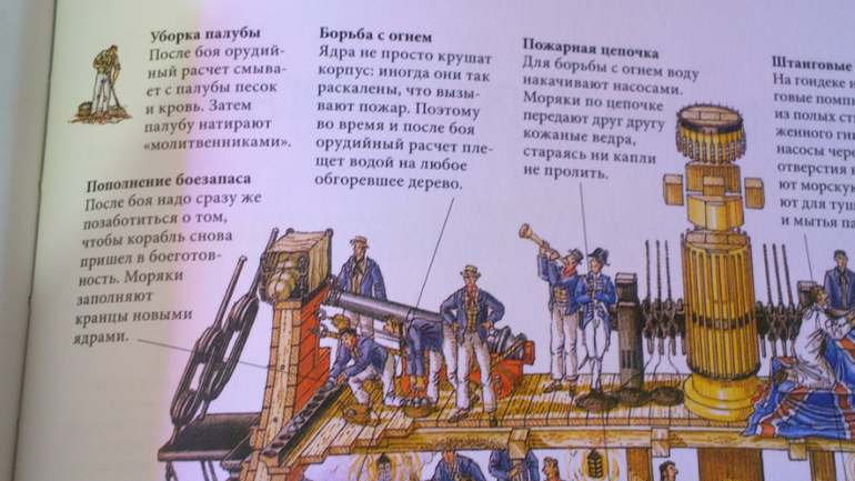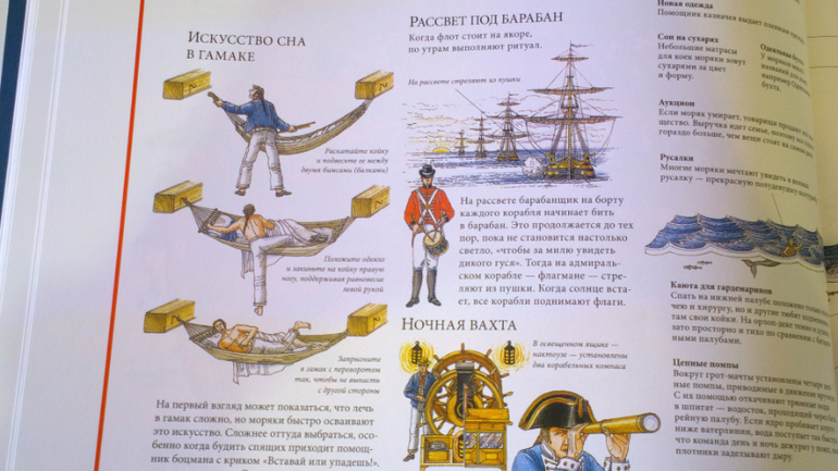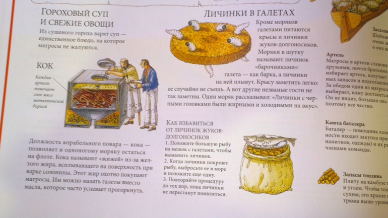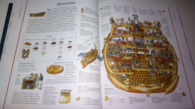 Безумно интересные иллюстрации показывают корабль в разрезе, а текст повествует о нелегкой жизни моряка.