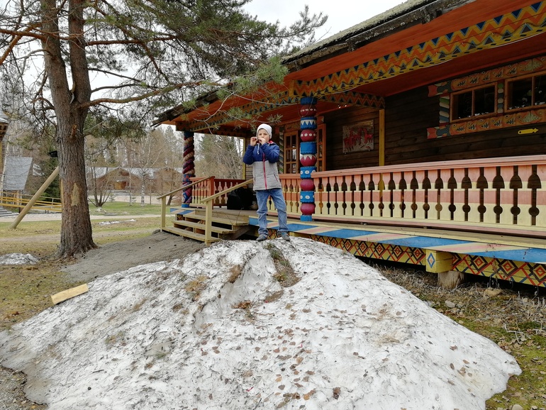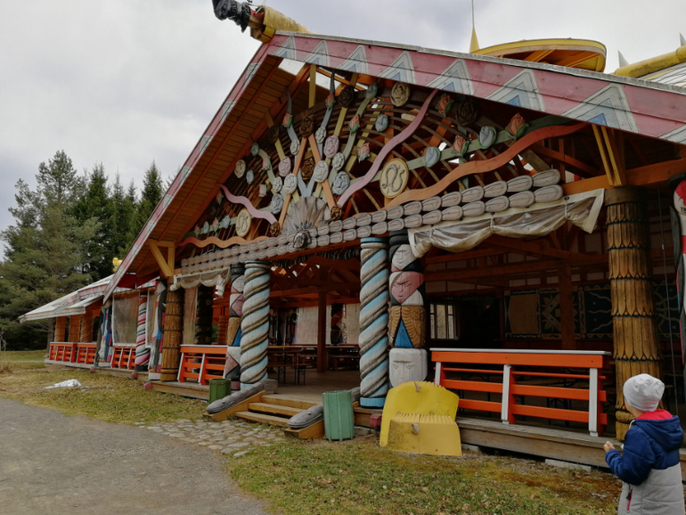 Представляю как здорово с нее лететь зимой! Но сейчас еще только май, несколько дней после начала работы деревни, половина домов закрыта и пустует. С другой стороны дороги несколько просто гигантских (на тысячи человек) навесы со столами для кормления туристов теплоходов.