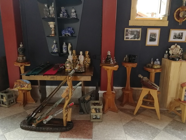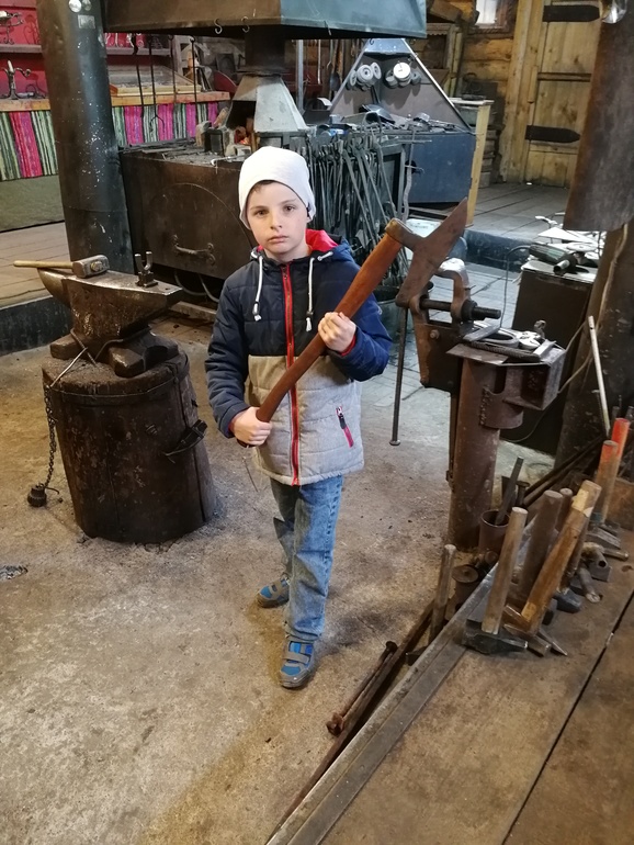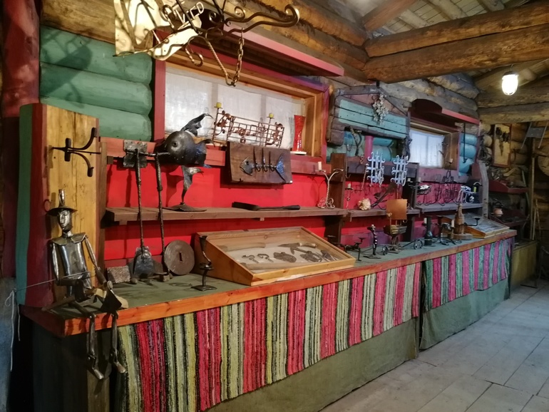 "Кузнец" провел вдоль прилавка, показал изделия, предложил купить. Горн не горит, кузнец не работает. Разрешил пофоткаться в интерьере: