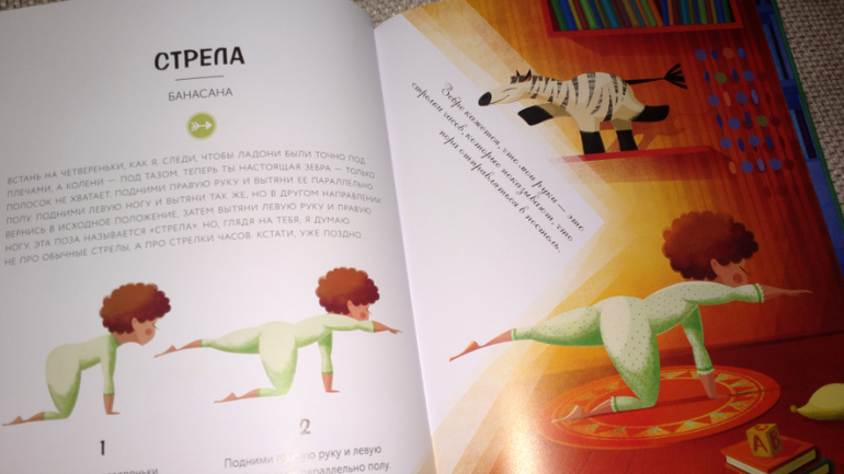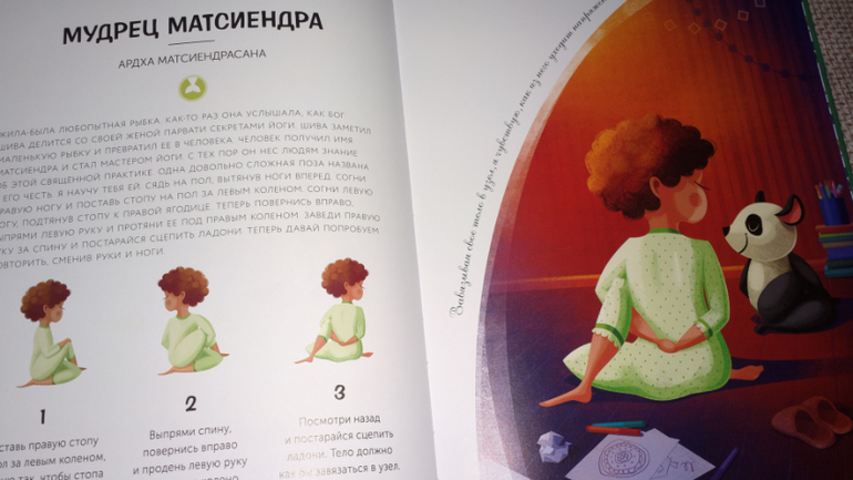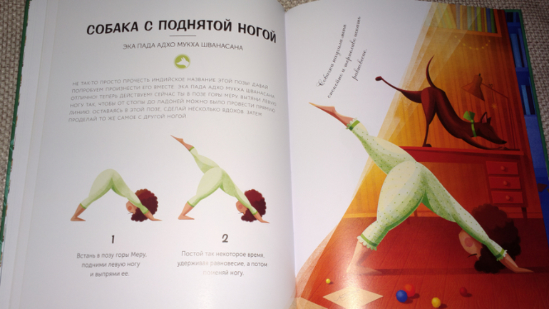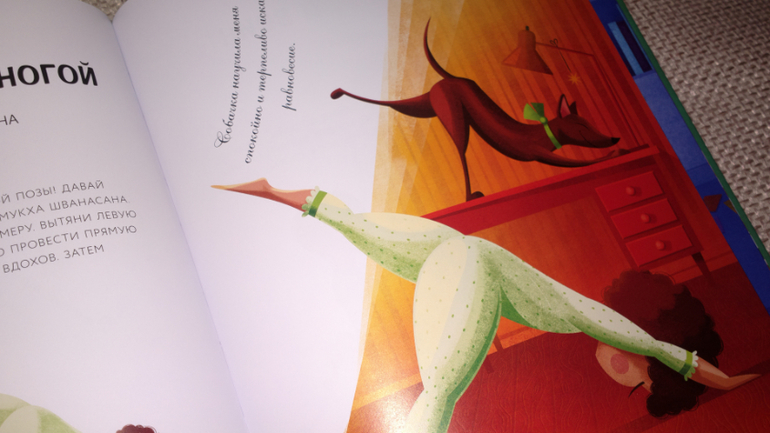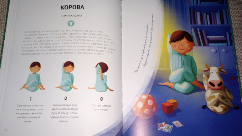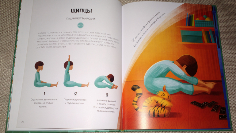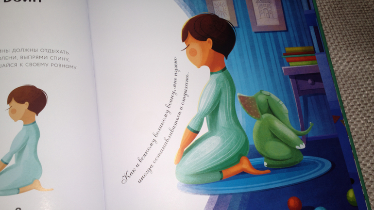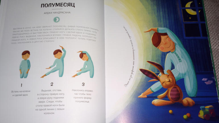 Мне очень понравились спокойные иллюстрации, они не взбудоражат ребенка перед сном, а настроят на спокойный лад. Упражнения, предлагаемые автором, спокойные, дети не будут "стоять на голове".