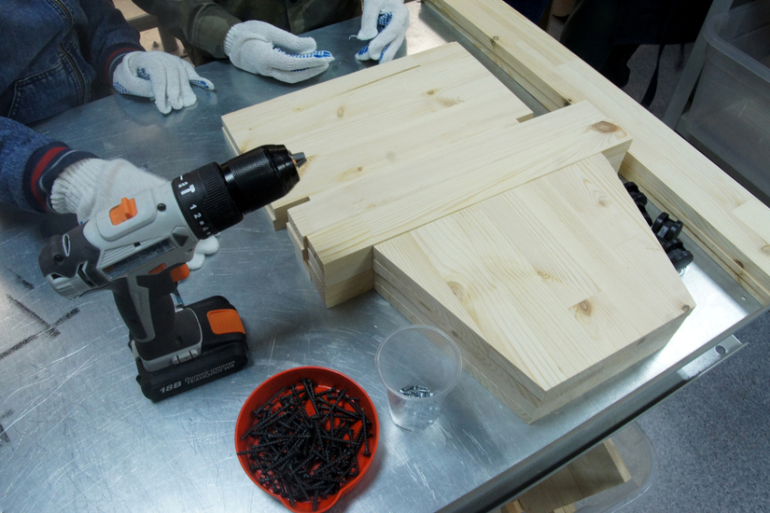 Я помогала стыковать и придерживать. Сверлили и собирали мальчики сами.
