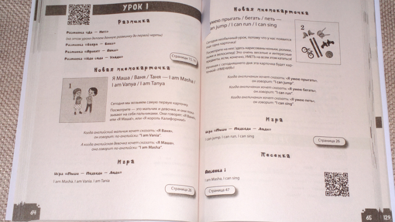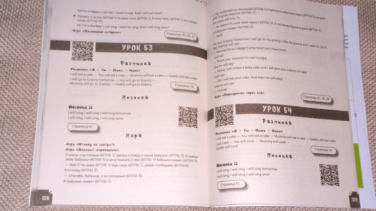В книге есть коды, по которым можно скачать отдельные песенки к каждому уроку. Но есть и ссылка, перейдя по которой, вы сможете скачать весь аудио-курс к данному пособию целиком ( и урок, и песенки). Это очень удобно.
