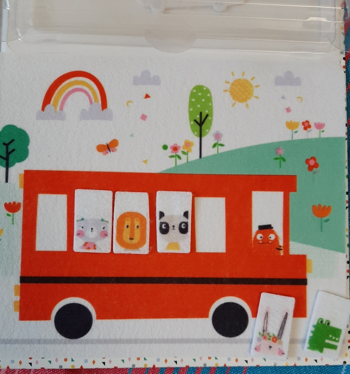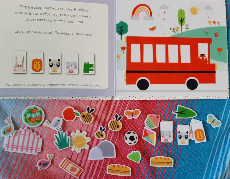 Любимый разворот моего ребенка с красным автобусом, где он рассаживает героев по местам!