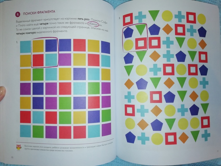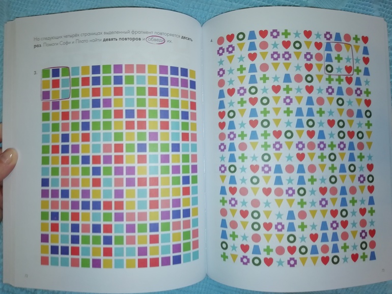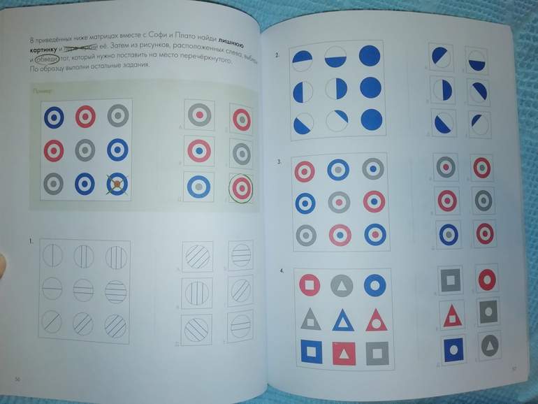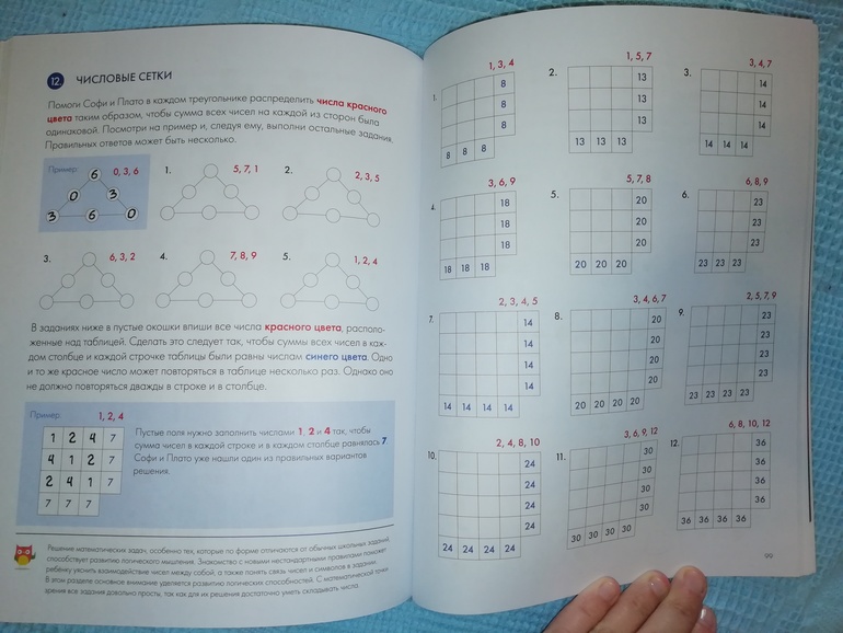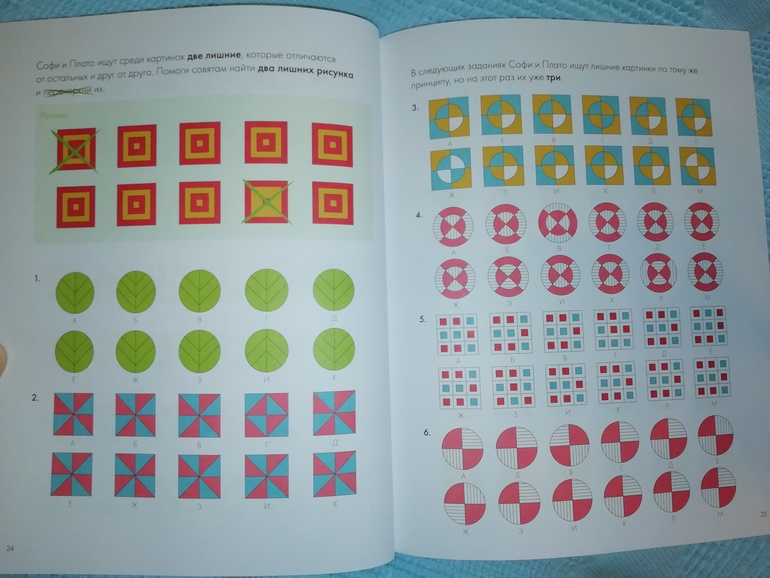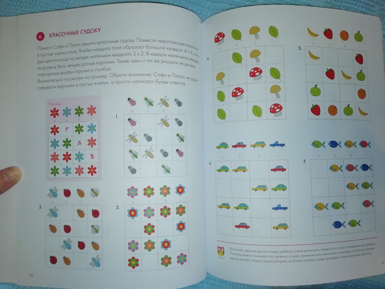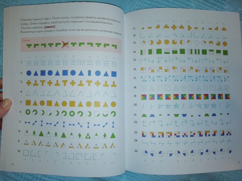 Ниже более подробно расскажу про каждый тип заданий. Всего 13 видов разных заданий, какие-то задания на внимание, какие-то на логику, есть задания на счет и даже словесные головоломки. Так как каждому типу заданий посвящено не так много разворотов, то они не успевают надоесть. Мне показалось, что задания расположены от простого к сложному. Дочка легко справилась с заданиями в начале книги, но словесные головоломки и числовые сетки ей еще совсем рано. Над какими-то заданиями даже я призадумалась. Мы еще не все задания выполнили, но пробовали разные типы и я хочу сказать, что довольно-таки интересно провести вечер, всей семьей решая головоломки.