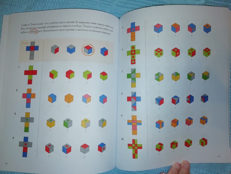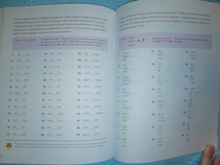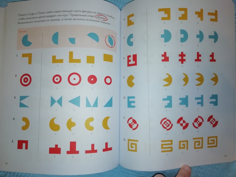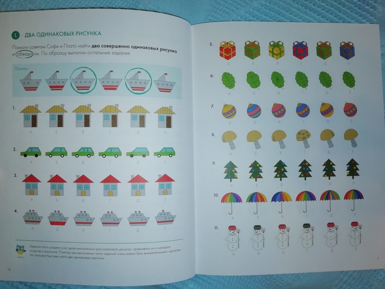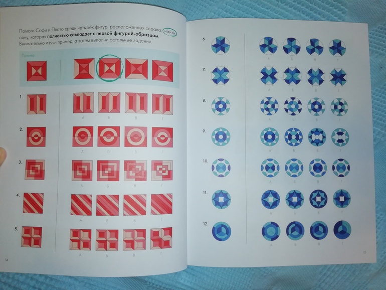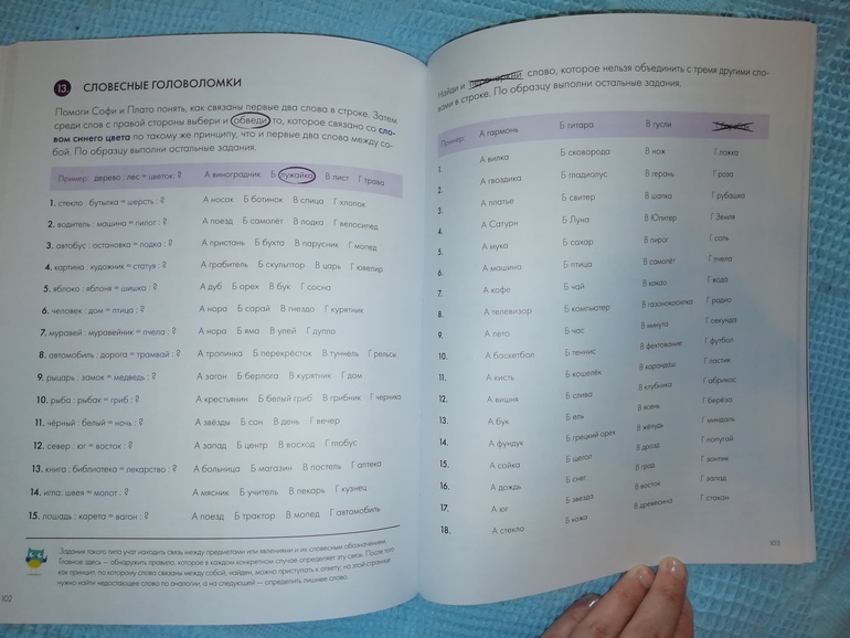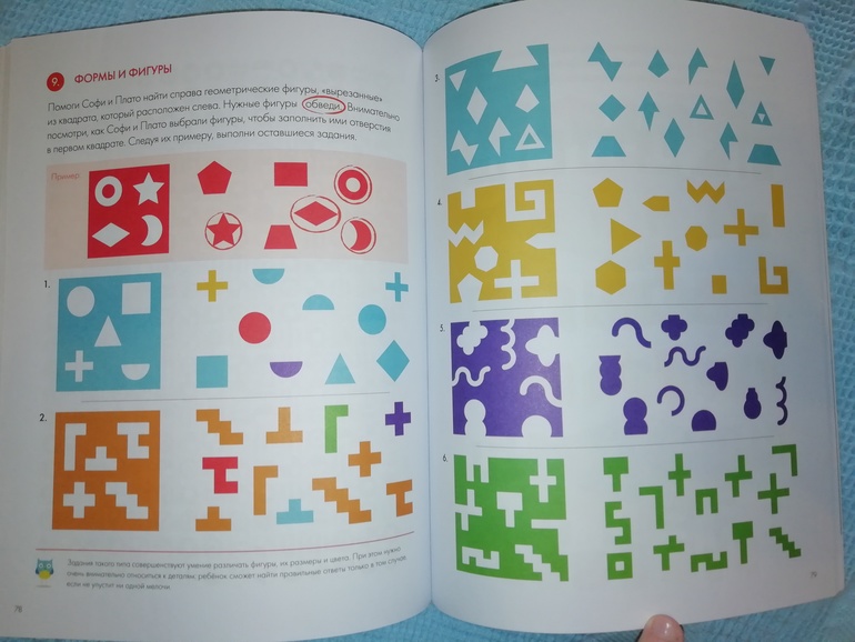 Ниже более подробно расскажу про каждый тип заданий. Всего 13 видов разных заданий, какие-то задания на внимание, какие-то на логику, есть задания на счет и даже словесные головоломки. Так как каждому типу заданий посвящено не так много разворотов, то они не успевают надоесть. Мне показалось, что задания расположены от простого к сложному. Дочка легко справилась с заданиями в начале книги, но словесные головоломки и числовые сетки ей еще совсем рано. Над какими-то заданиями даже я призадумалась. Мы еще не все задания выполнили, но пробовали разные типы и я хочу сказать, что довольно-таки интересно провести вечер, всей семьей решая головоломки.