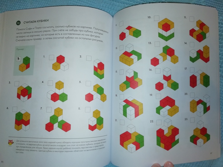 Следующий тип заданий- посчитать количество кубиков на картинке. Развивает пространственное мышление.