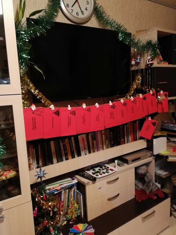 Подготовка была утром, пока не пришли гости. Натянула веревку, повесила конверты с заданиями: