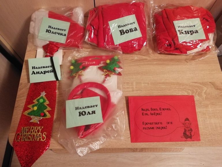 Разложила пакеты с красной одеждой и новогодними колпаками: