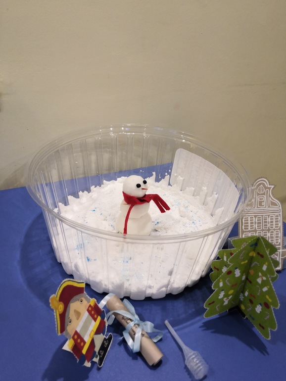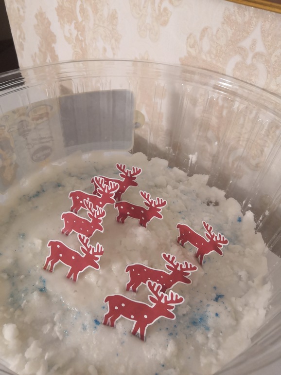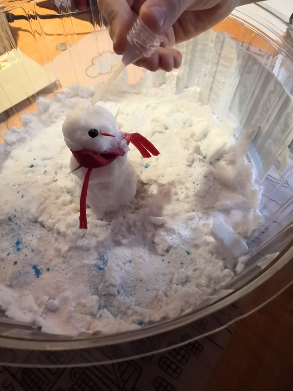 А была она закатана в снеговика, который я сделала из соды, воды и растительного масла. Подготовится нужно было за сутки, чтоб снеговик подсох. Нужно было растопить снеговика, поливая со шпринцовки раствором лимонной кислоты! Снеговик как будто таил. В одном из комов была звезда, которую потом определили на ёлку.