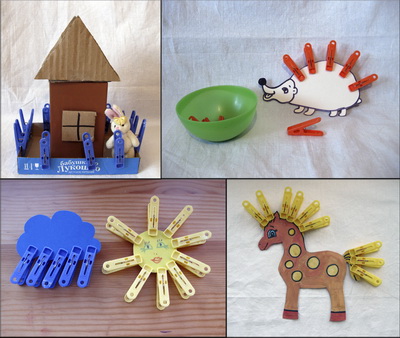 Распечатала картинку, приклеила на картон (от какой-то коробки). Изображения зверей приклеила к деревянным прищепкам.