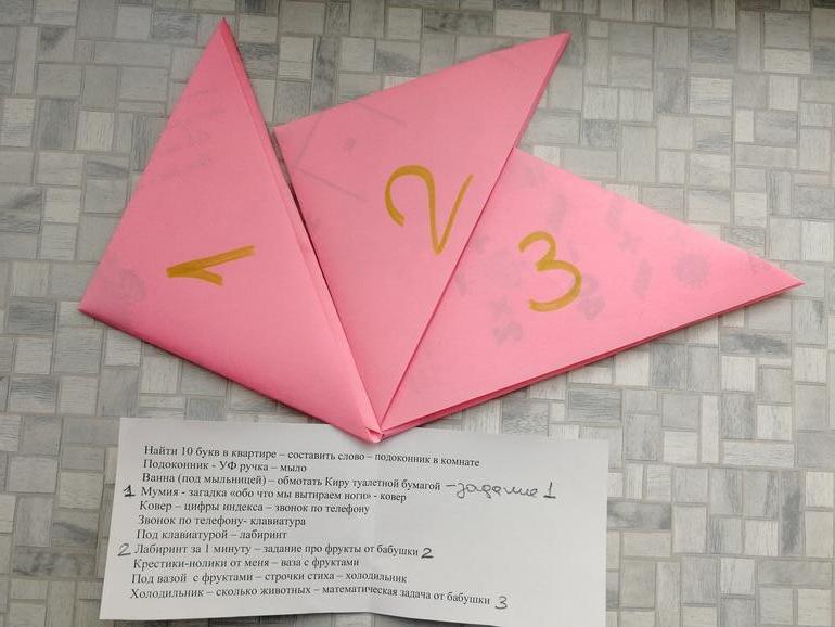 Три задания, которые надо получить у меня после выполнения определенных заданий, я сложила треугольниками и спрятала до поры до времени: