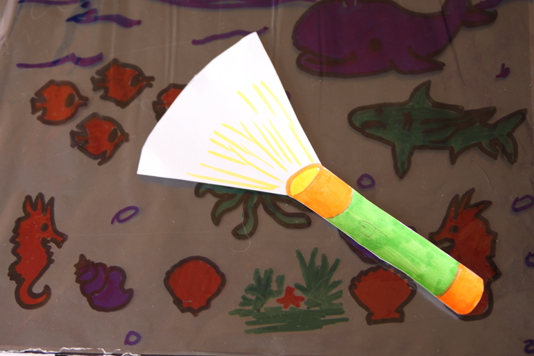 Делаем бумажный фонарик, обязательно с лучом. Фонарик приклеить лучше на картон, чтобы детям было удобно держать в руках.