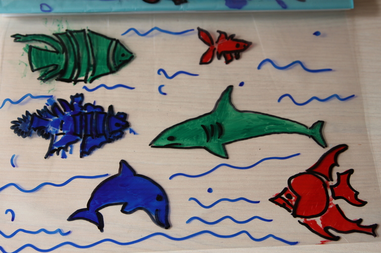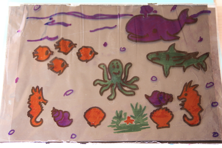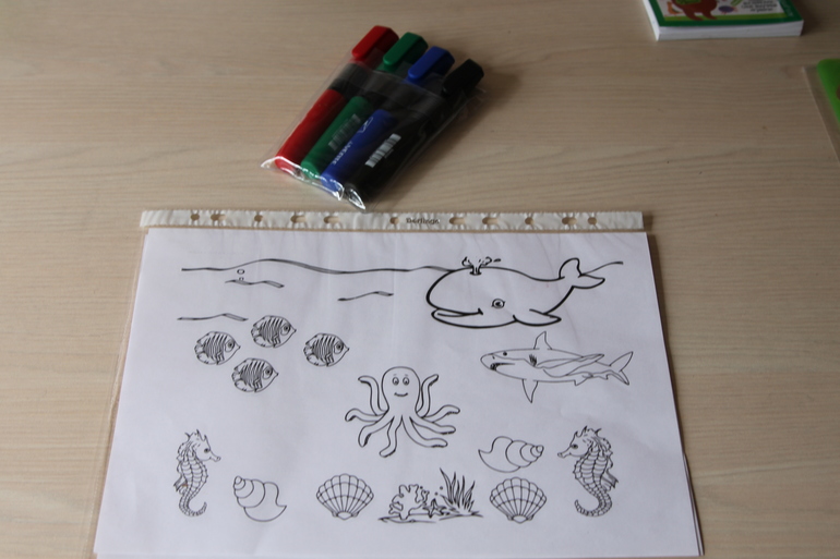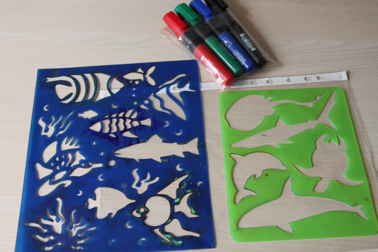 Для работы нам потребуется: файлы, черная бумага, трафареты с морскими обитателями, маркеры перманентные, раскраска с морскими обитателями.
