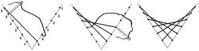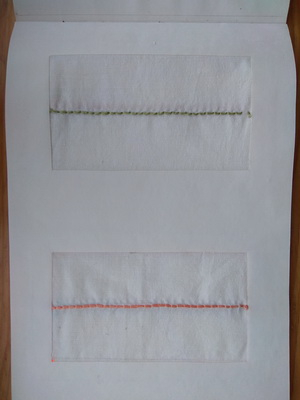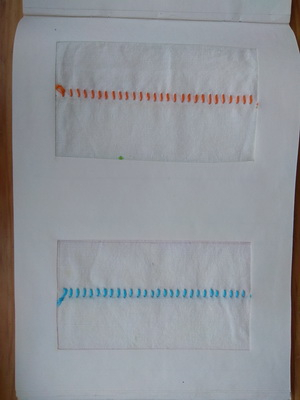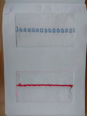 После этого перешили к работе с тканью. На ткани я чертила линию и делила её на отрезки - точки ввода-вывода иголки, чтобы стежки были одинаковые. (Возможно, это было ошибкой, и следовало развивать глазомер… Ну да ладно.)