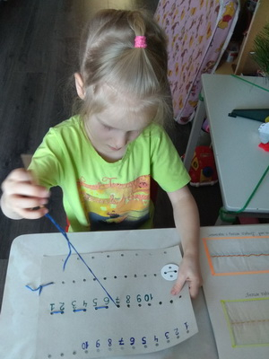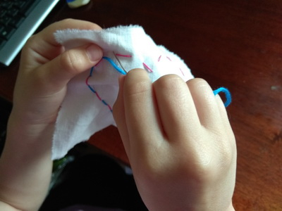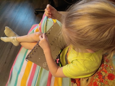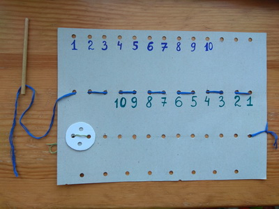 На куске картона я сделала дыроколом дырки, из ручки от кисточки - иголку, в которую вдела вязальную нить (или мулине, уже не припомню). Дочка пробовала «шить» на этом картонном тренажёре. Задача состояла не только в том, чтобы разобраться в какую «дырочку» и с какой стороны вводить иголку, но и в том, чтобы научиться эту иголку правильно держать.