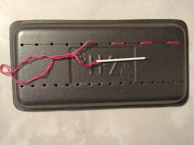 Позже я сделала тренажер из подложки от печенья, иголку - из стрежня ручки. На тренажере дырочки были у'же, приходилось «вталкивать» иголку с небольшим усилием. А расстояние между стежками в строчках становилось меньше.