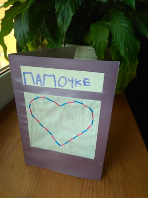 Освоив шов «Вперёд иголку», мне захотелось, закрепить у дочки умение его выполнять. Как раз у папы приближался день рождения, и мы решили сделать подарок-открытку с использованием изученного шва. На кусочке ткани дочка вышила розовым цветом сердце, а между строчками, используя тот же шов, прошила голубым цветом. Получилось красиво!