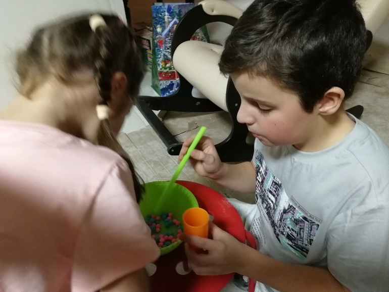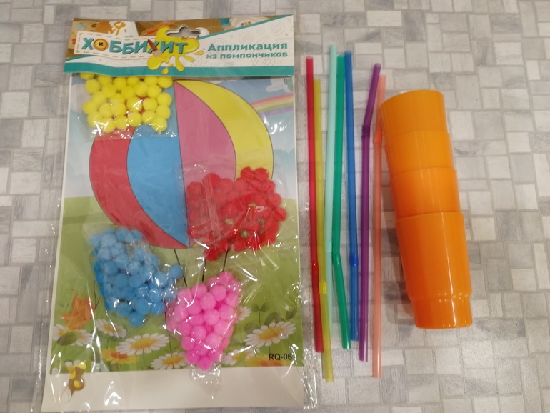 Цветные шарики своего цвета 4 участника вытаскивали соломинками и складывали в стаканчики. Победившему - приз: