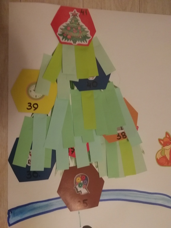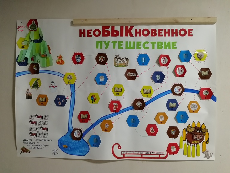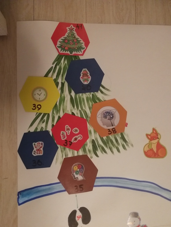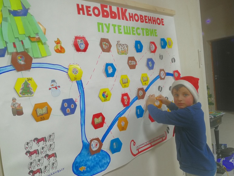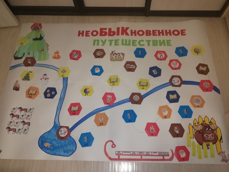 Прикрепила плакат на стену рейкой. Отметила красным маркером задания, через которые можно перепрыгивать (выполнять уже после получения подарков):