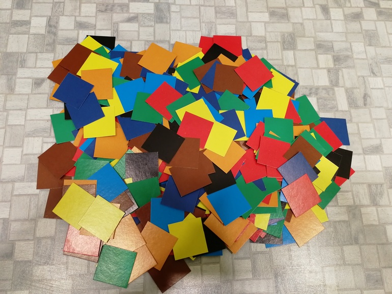 Для игры Эрудит (Словодел, Scrabble) нарезала из цветного картона море квадратиков: