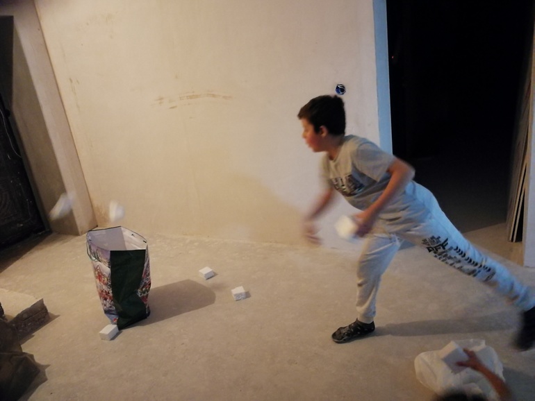"Снежки". Из пенопласта нарезала кусочки "снежков", которыми старались попасть в импровизированное ведро: