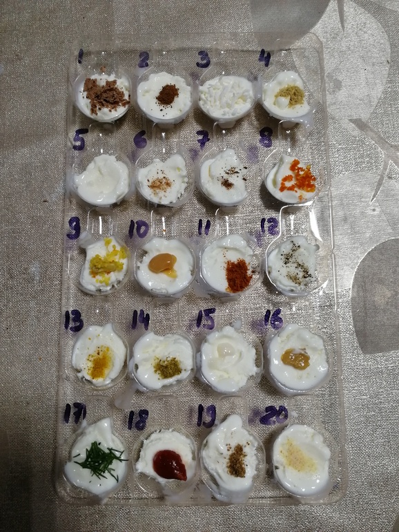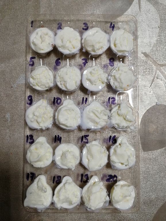 Для перекуса мороженным в упаковку от маленьких ёлочных украшений заморозила шарики мороженого с разными вкусами: корица, имбирь, лимон, мандарин, шоколад, кедровый орех, вареная сгущенка, малина, клубника (для детей); перец, кориандр, хрен, чеснок, горчица, кетчуп, паприка, укроп, карри (для взрослых):