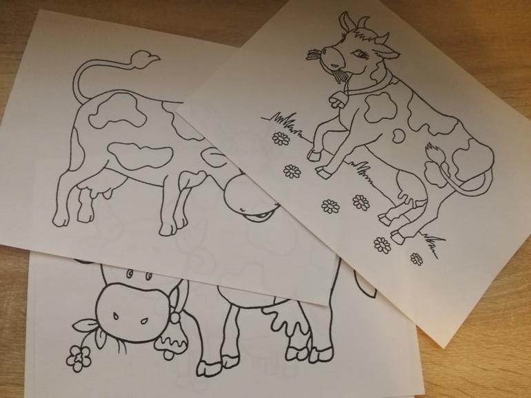 Ну, тут просто. Распечатала несколько рисунков коров для раскрашивания всеми желающими: