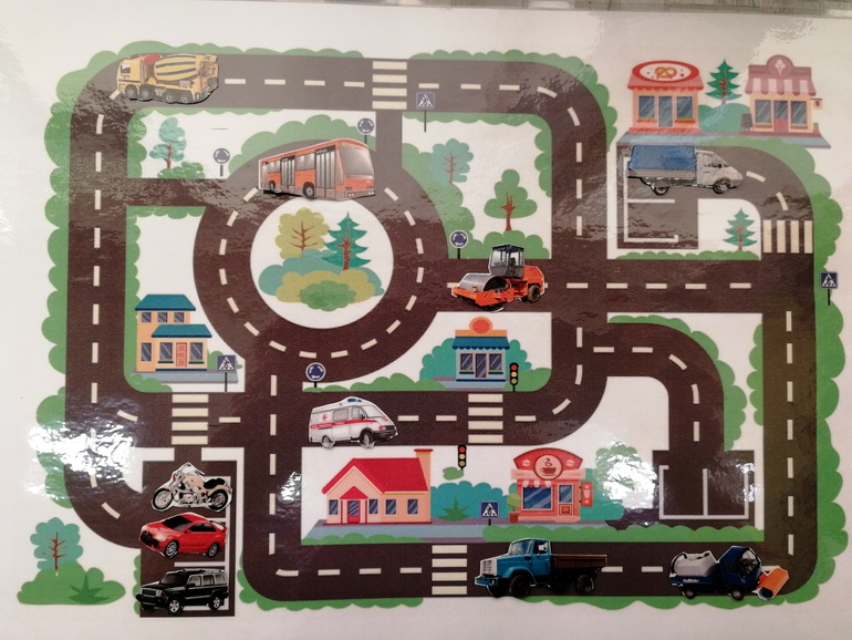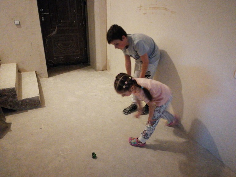 Для автопарковки нарисовала на полу мелом два квадрата. Кто быстрее поставит на парковку инерционную машинку.