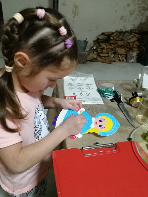 Снежинки накопировала из интернета, распечатала на голубой бумаге, разрезала. Нашли не сразу. И сделала это Кирюша!