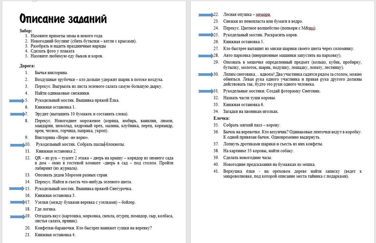 Стрелочками обозначены задания, которые не обязательно проводить ДО получения подарков. Можно потом в спокойном режиме для желающих их разыгрывать и неспящих до полуночи.
